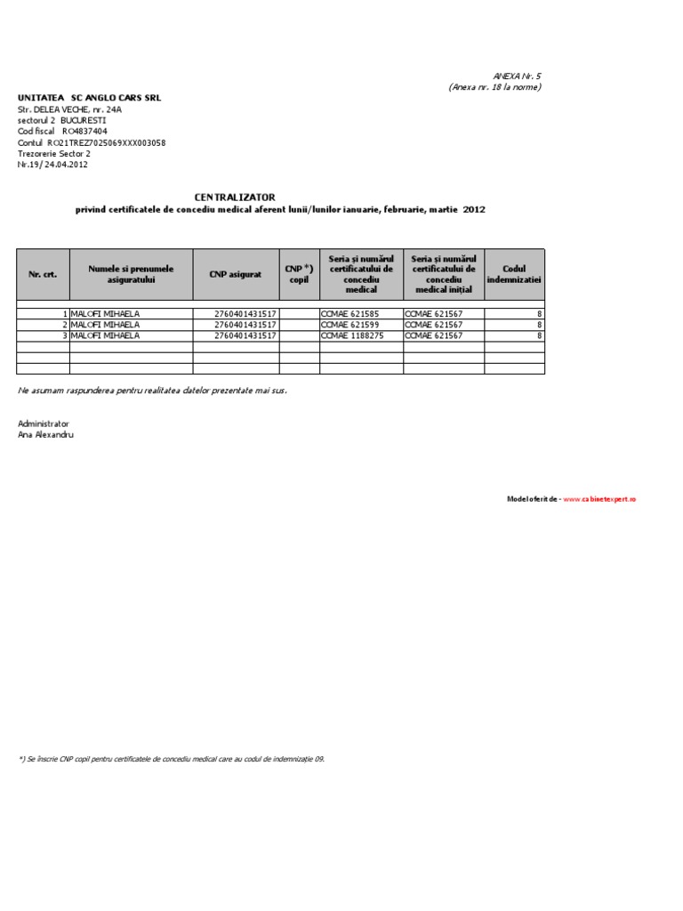 Centralizator privind certificatele de concediu medical aferente lunii lunilor pentru care se solicită recuperarea sumei conform modelului prevăzut în anexa 1 la ordinul nr 15 1 311 2018. Centralizator privind certificatele de concediu medical aferent lunii lunilor normă. Model actualizat centralizator privind certificatele de concediu medical anexa 1 la norme in format editabil. De concediu medical seria şi numărul certificatului de concediu medical iniţial codul indemnizaţiei ne asumăm răspunderea pentru realitatea datelor prezentate mai sus.