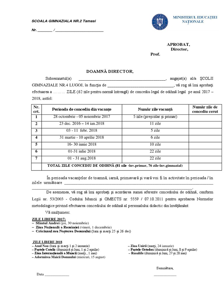 1233 din data de 28 11 2017. Suma zilelor din coloana activitate trebuie sa fie 12 avand in vedere ca zilele de concediu de odihna sunt 62 iar zilele de vacanta din anul scoalar 2016 2017 sunt 75. Model cerere concediu de odihna. May 23 2017 elena savciuc 1 comment.