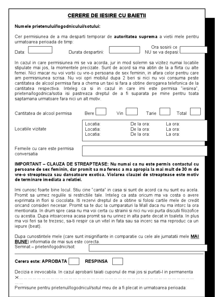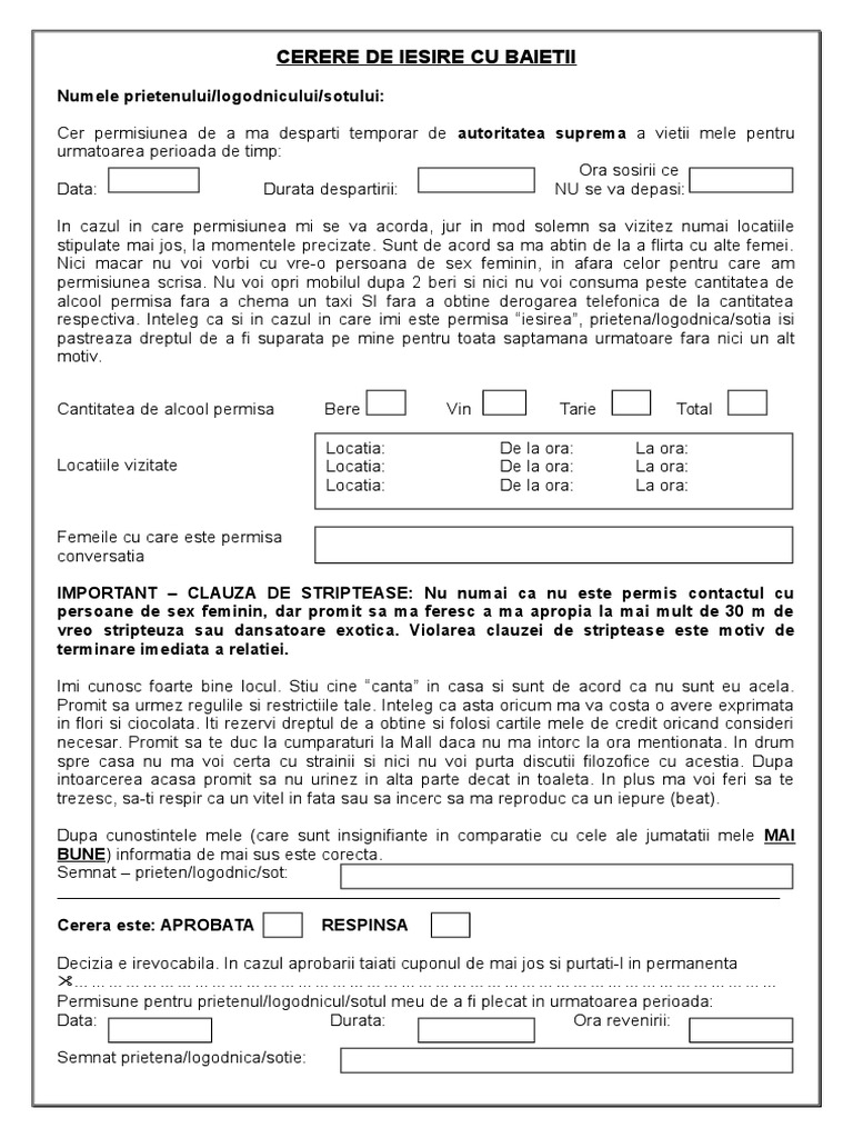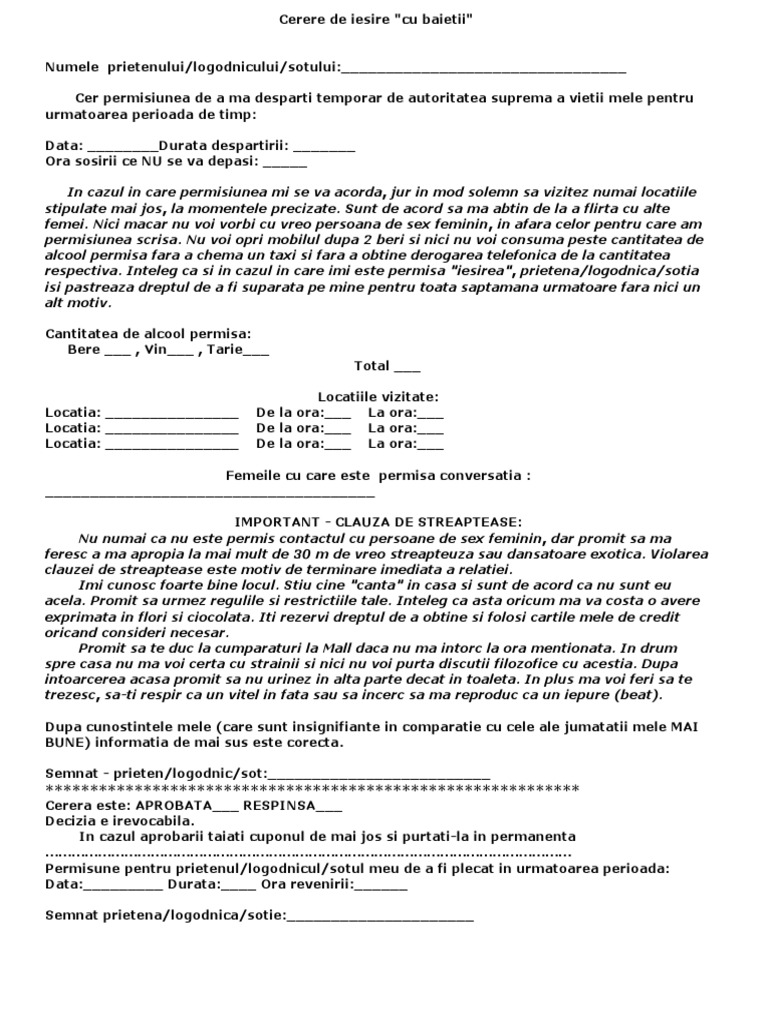 Cerere de iesire cu baietii. Teddy sbk november 19 at am. Cerere de iesire cu baietii. O prietena mi a trimis pe mail o cerere de iesire cu baietii pe care noi fetele sa o aprobam si semnam atunci cand partenerii nostri vor sa iasa in oras neinsotiti asa ca baietii.