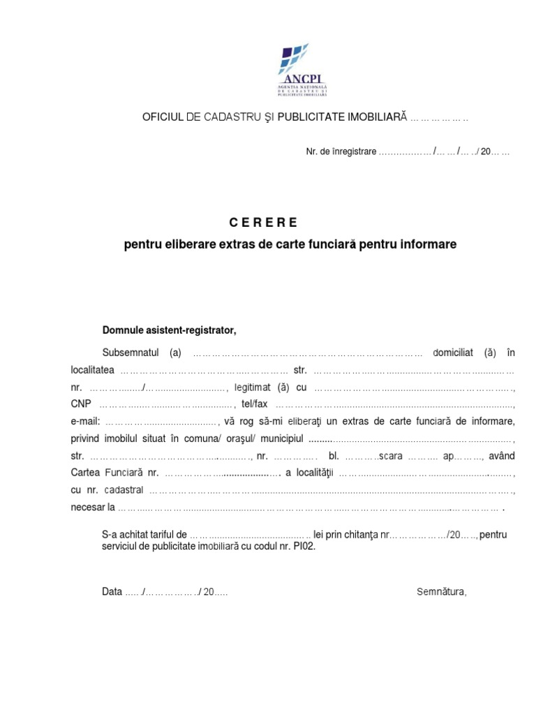 Cerere pentru eliberare extras de carte funciara pentru informare descarca. Cerere eliberare certificat sarcini descarca. Solicita extras de carte funciara online si il primesti pe mail. Cerere de inscriere in cartea funciara descarca.