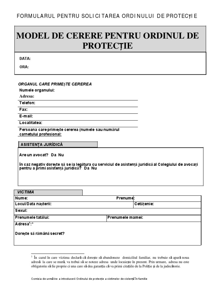 Cerere ordin de protectie. A ascendentii si descendentii fratii si surorile copiii acestora precum si persoanele devenite prin adoptie potrivit legii astfel de rude. Da nu c limitarea. Comisia de urm ărire a introducerii ordinului de protecție a victimelor de violență în familie. Ordinul de protecție se concretizează într o hotărâre judecătorească prin care persoanele care sunt victime ale violenței în familie pot obține luarea anumitor măsuri ori impunerea unor obligații în sarcina agresorului cu scopul de a le asigura acestora protecție și respectarea integrității fizice și psihice precum și a libertății față de agresor.