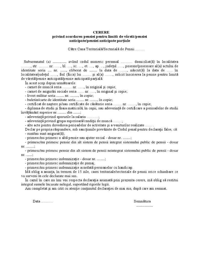 Privind acordarea pensiei pentru limită de vârst. în cazul în care nu îmi voi respecta declaraţia asumată prin prezenta cerere mă oblig să restitui integral sumele încasate nelegal suportând rigorile legii. Cerere pentru acordarea pensiei de limita de varsta pensiei anticipate pensiei anticipata partiala nr din catre casa judeteana de pensii. Cerere privind acordarea pensiei pentru limită de vârstă pensiei anticipate pensiei anticipate parţiale către casa teritorială sectorială de pensii.