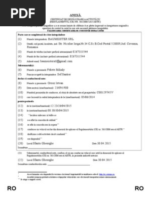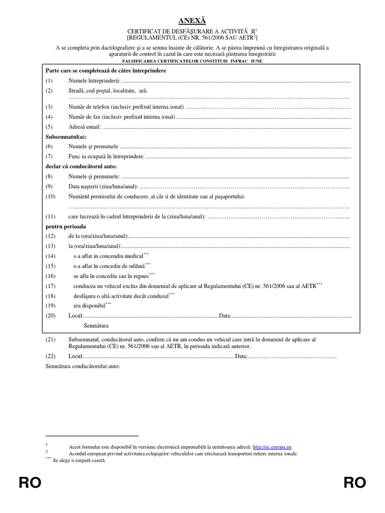 Este obligatoriu de completat în toate cazurile în care șoferul nu poate prezenta înregistrarea timpilor de conducere pentru perioada de 28 de zile. Certificat de desfãsurare a activitätii regulamentul ce nr. A se păstra împreună cu înregistrarea originală a aparaturii de control în cazul în care este necesară păstrarea înregistrării. Attestation of activities under regulation ec no 561 2006 or the european agreement concerning the work of crews of vehicles engaged in international road transport aetr a se completa prin dactilografiere şi a se semna înainte de cãlãtorie.