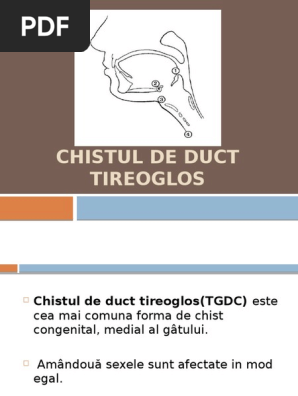 Urma cu o luna tatal meu a fost operat de chist de canal tireoglos dar la momentul acela medicii nu i au facut biopsie acum ne intrebam era necesara biopsia in cazul acestui chist va rog lamuriti ma multumesc anticipat. Forum medical a zis ca dumneaei crede ca este chist de canal tireoglos acum am racit si mi s a inflamat din nou este tare si ma doare a inceput sa se traga dreapta va rog sa imi spuneti ce credeti ca este va multumesc. Chist de canal tireoglos secțiunea. Chist tireoglos chisturile de duct tireoglos.