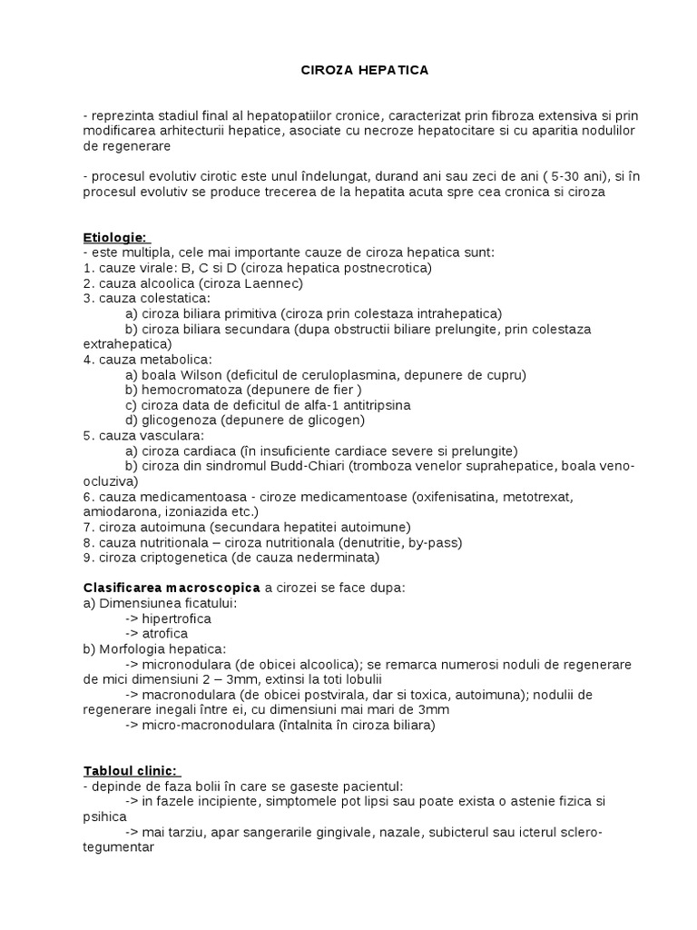 Ciroza hepatică este definită ca dezvoltarea histologică a nodulilor regenerativi înconjurați de benzi fibroase ca răspuns la leziunile hepatice cronice.