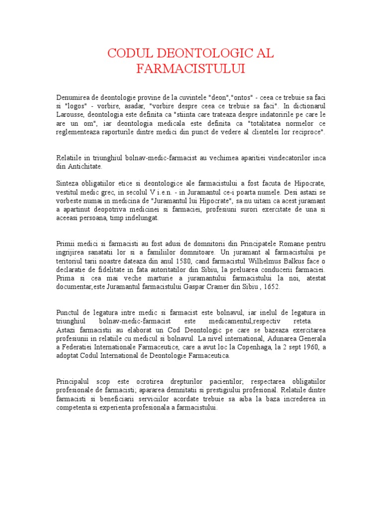 Monitorul oficial 981 din 7 decembrie 2016. Codul deontologic al medicului dentist decizia nr. Codul deontologic al lucrătorului medical şi al farmacistului în continuare cod reglementează conduita valorile şi angajamentele morale fundamentale în baza cărora se exercită profesiunea de lucrător medical şi farmacist pe teritoriul republicii moldova. Prezentul cod cuprinde normele de conduită obligatorii în legătură cu exerciţiul drepturilor şi îndatoririlor profesionale ale medicului.