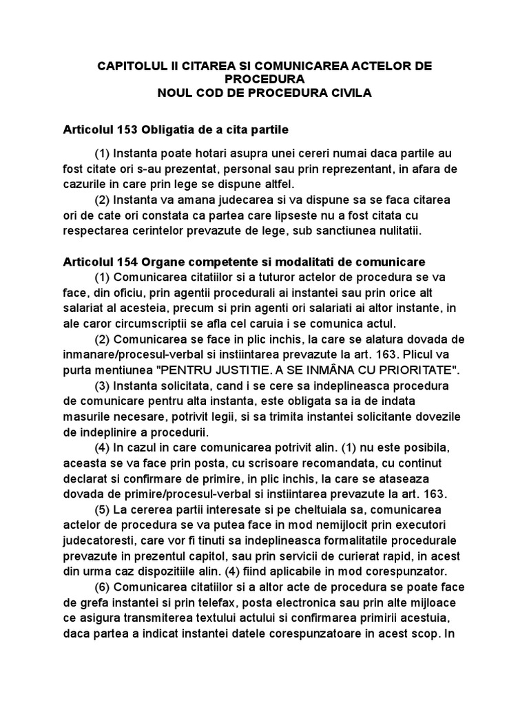 160 noul cod de procedură civilă invocarea şi înlăturarea neregularităţilor privind citarea citarea şi comunicarea actelor de procedură. 160 noul cod de procedură civilă invocarea şi înlăturarea neregularităţilor privind citarea citarea şi comunicarea actelor de procedură. 159 noul cod de procedură civilă termenul pentru înmânarea citaţiei citarea şi comunicarea actelor de procedură. Cand legea sau instanta dispune ca citarea partilor sau comunicarea anumitor acte de procedura sa se faca prin afisare aceasta afisare se va face la instanta de catre grefier iar in afara instantei de agentii insarcinati cu comunicarea actelor de procedura incheindu se un proces verbal potrivit art.