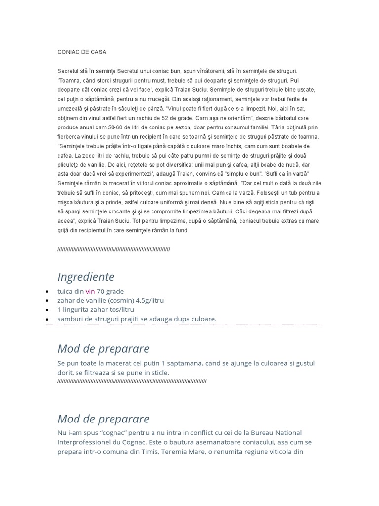 La un litru de coniac folosesc 2 pliculete de ceai negru pe care le tin acolo cel putin 2 saptamani. Din 60 de kg de struguri obtineti 10 litri de coniac de 40. Acest lucru necesită un fel de struguri albi și fotografii de cupru speciale alambiki. La bază coniacul de calitate superioară se face numai din anumite soiuri de viță de vie colombard folle blanche montils ugni blanc sémillon.