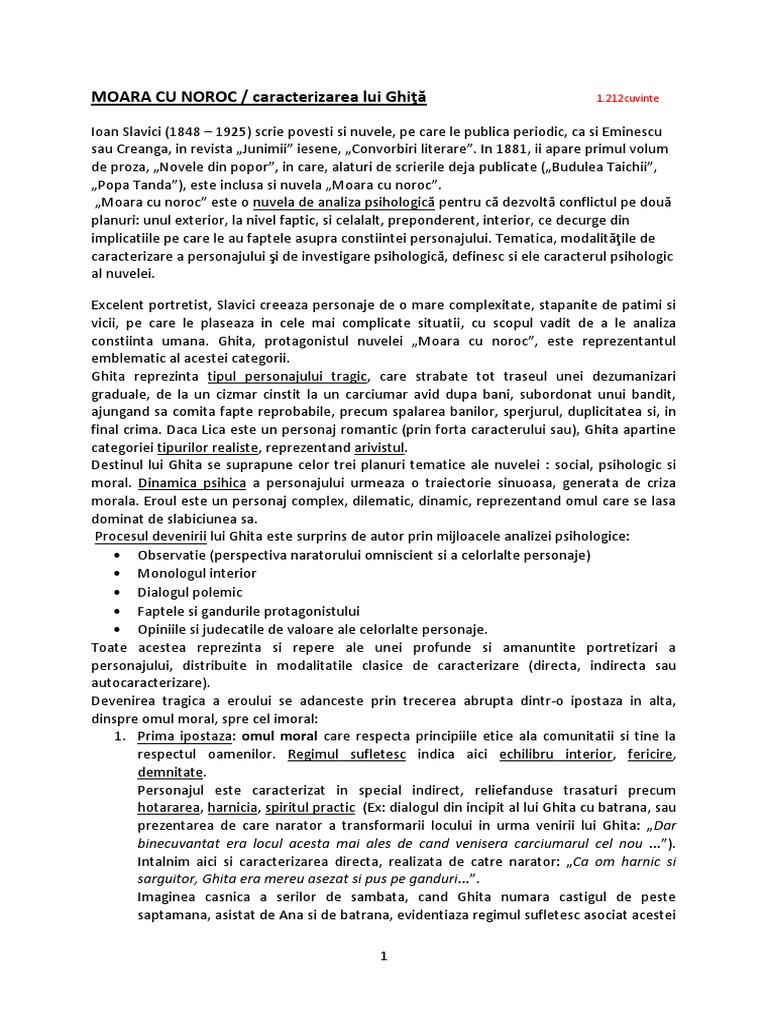 In primul rand personajul principal ghita se impune a fi analizat din perspectiva tematicii abordate. Opera literara moara cu noroc este scrisa de ioan slavici si publicata in volumul novele din popor in anul 1881 si are ca personaj principal pe ghita un personaj complex ale carui trasaturi sunt bine evidentiate pe parcursul intregului subiect atat prin intermediul caracterizarii in mod direct cat si prin. Nuvela moara cu noroc de ioan slavici apărută în anul 1881 este o operă realist psihologică cu spirit moralizator prin care autorul critică lipsa de valori spirituale ale omenirii. Să cârpesc şi mai departe cizmele oamenilor care umblă toată săptămâna în opinci ori desculţi iară dacă dumineca e noroi îşi duc cizmele până la biserică.