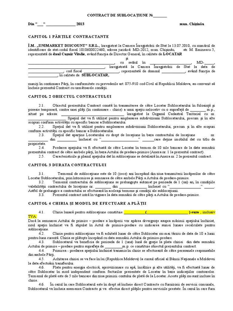 Chiria se factureaza lunar cu tva conform contractului. Prezentul contract de închiriere poate înceta și înainte de data sus menționată prin acordul scris al ambelor părți. 1 833 cod civil si a urmatoarelor clauze. Contractul de subinchiriere are caracterul unui contract accesoriu fata de contractul principal de inchiriere a unei suprafete locative a locuintei si urmeaza caracterul juridic al acestuia.
