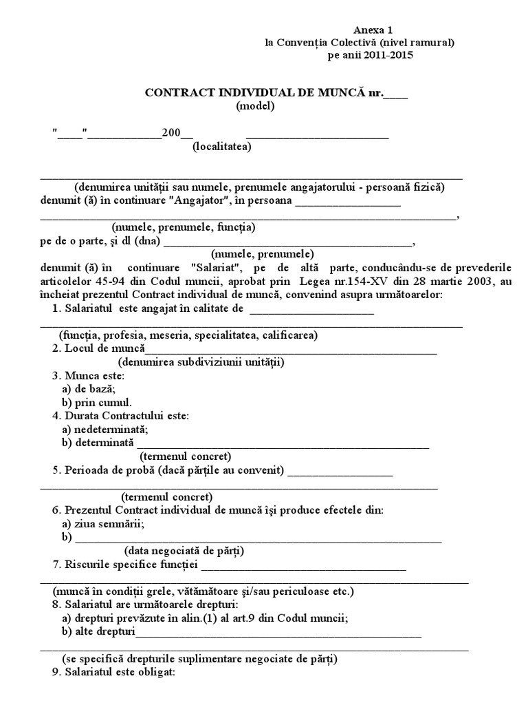 Prin modificarile si completarilor aduse codului muncii in anul 2018 vezi forma actualizata 2020 a codului muncii precum si prin prin legea nr. Nu pot incheia un contract de munca orice contract individual de munca in calitate de salariat. Conform art 10 din codul muncii. Contract individual de muncă model oficial 2016 descărcare gratuită abonare la blog via email introdu adresa de email pentru a te abona la acest blog și vei primi notificări prin email când vor fi publicate articole noi.