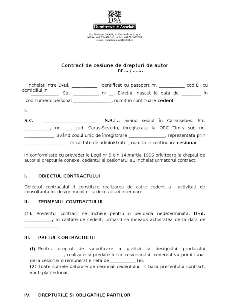 Contract pe drepturi de autor. Dreptul de autor este reglementat prin legea 8 1996 privind dreptul de autor si drepturile conexe cu modificarile si completarile ulterioare publicata in monitorul oficial nr. Categorii de drepturi de proprietate intelectuală. 8 1996 privind dreptul de autor şi drepturile conexe cu modificările şi completările ulterioare denumită în continuare legea nr. Model contract drepturi de autor.
