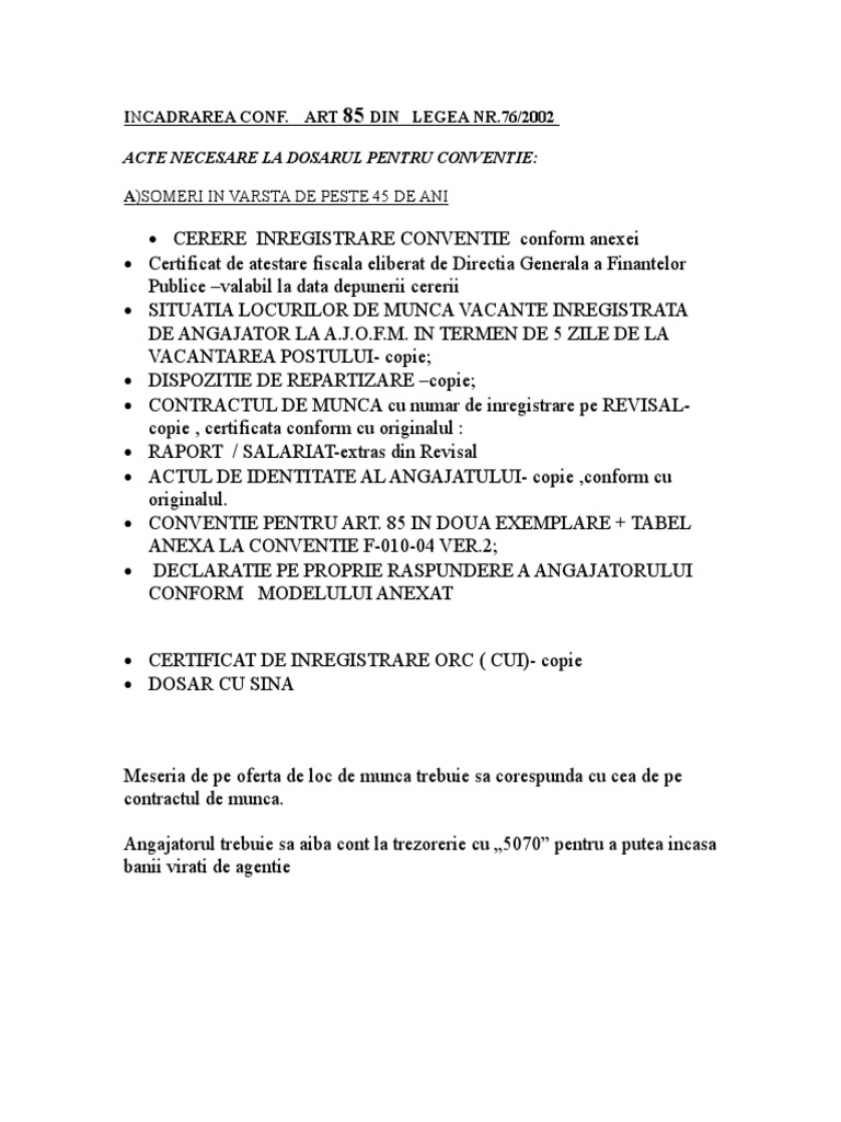 Conventie somaj peste 45 de ani. Actele necesare incheierii conventiei pentru someri peste 45 ani angajatorii care încadrează în muncă pe perioadă nedeterminată şomeri în vârstă de peste 45 de ani primesc lunar pe o perioadă de 12 luni pentru fiecare persoană angajată din acesta categorie o sumă în cuantum de 2250 lei cu obligaţia. Art 85 peste 45 de ani. Potrivit prevederilor art 85 alin 1 angajatorii care incadreaza in munca pe perioada nedeterminata someri in varsta de peste 45 de ani sau someri care sunt parinti unici sustinatori ai familiilor monoparentale sunt scutiti pe o perioada de 12 luni de plata contributiei datorate la bugetul asigurarilor pentru somaj aferenta persoanelor. Angajatorii care incadreaza in munca pe perioada nedeterminata someri in varsta de peste 45 ani.