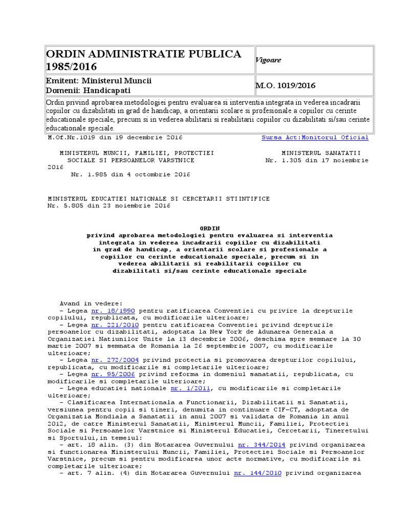Criterii de incadrare in grad de handicap 2016. Ministerul muncii a publicat în dezbatere publică un ordin pentru modificarea și completarea ordinului pentru aprobarea criteriilor medico psihosociale pe baza cărora se stabileşte încadrarea în grad de handicap mai exact ordinul nr. Procesul presupune colectarea de informații cât mai complete și interpretarea acestora în scopul orientării asupra deciziei și. Criterii medico psihosociale de încadrare în grad de handicap din 19 noiembrie 2007 la data 27 dec 2007 actul a fost aprobat de ordinul 1992 2007 capitolul 1. Capitolul v încadrarea în grad de handicap art.
