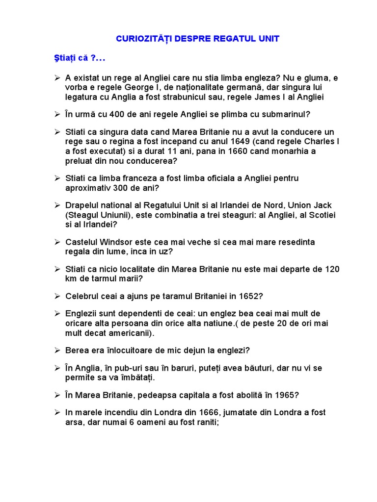 Regina marii britanii este deținătoarea legală a unei șesimi din întreaga suprafață a terrei. Fraza pe care englezii o folosesc in aceste pauze este shall i put the kettle on. Capitala marii britanii este una dintre cele mai populare destinații de vacanță din întreaga lume. Prima zoologică publică din lume a fost deschisă pentru prima dată în 1829 la londra london zoo.