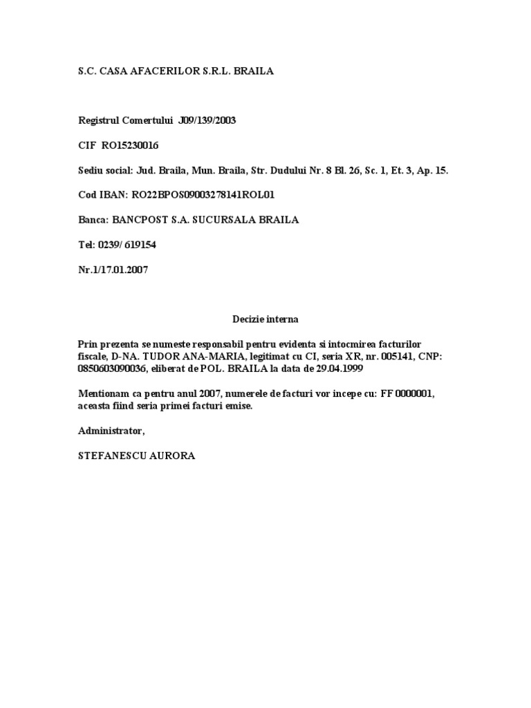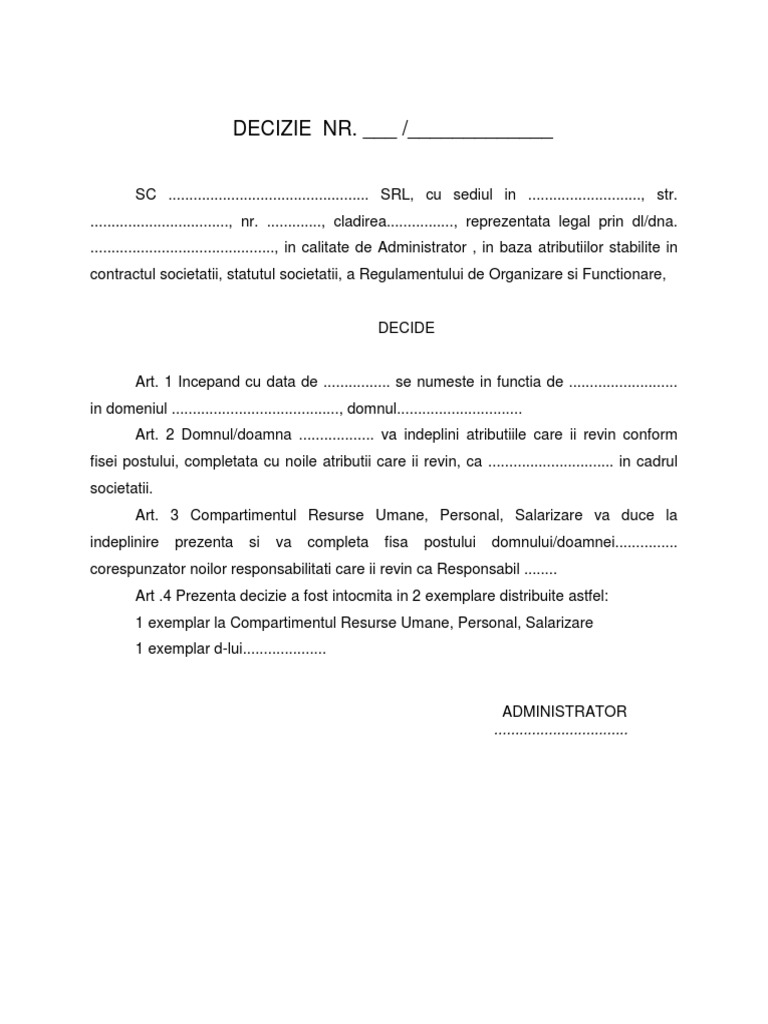 Asadar registrul de evidenta a salariatilor revisal se compleaza si se transmite fie de persoana persoanele numite de angajator prin decizie scrisa fie de prestatorul de servicii inregistrat la inspectoratul teritorial de munca care a incheiat cu angajatorul un contract de prestari servicii. Use the download button below or simple online reader. Model decizie interna de numire in functie there is document model decizie interna de numire in functie available here for reading and downloading. Doc decizie de numire rte sirbescu sandra academia edu.