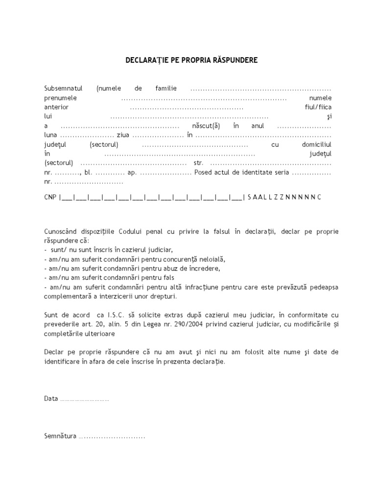 Declaratie pe propria raspundere cazier. Declaratie privind cazierul fiscal. înţeleg că trebuie să consult un medic înainte de a efectua orice activitate sportivă la nivel. Tpuscasu last modified by. 326 cod penal cu privire la declaratiile nesincere prin prezenta declar pe proprie raspundere ca nu.
