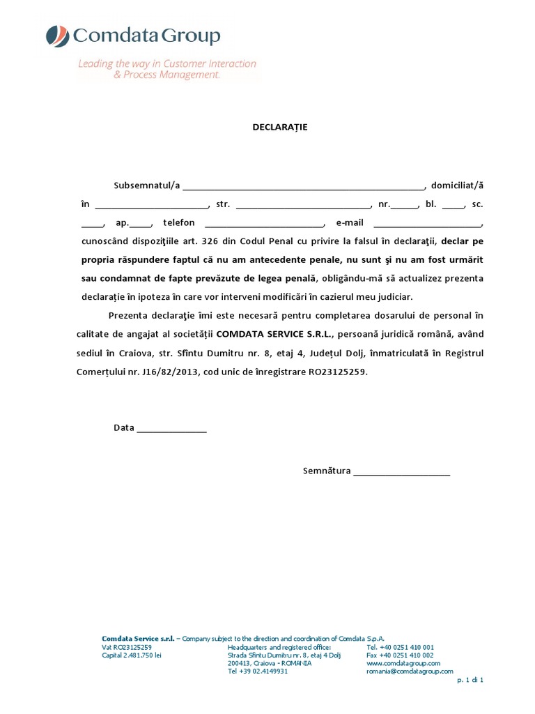 We would like to show you a description here but the site won t allow us. Se va completa adresa locuinței în care persoana locuiește în fapt indiferent dacă este identică sau nu cu cea menționată în actul de identitate. Declaraţie pe propria răspundere privind cazierul doc. Codul penal cu privire la falsul în declaraţii declar prin prezenta pe propria răspundere că voi renunţa la postul de manager deţinut la în condiţiile în care sunt.