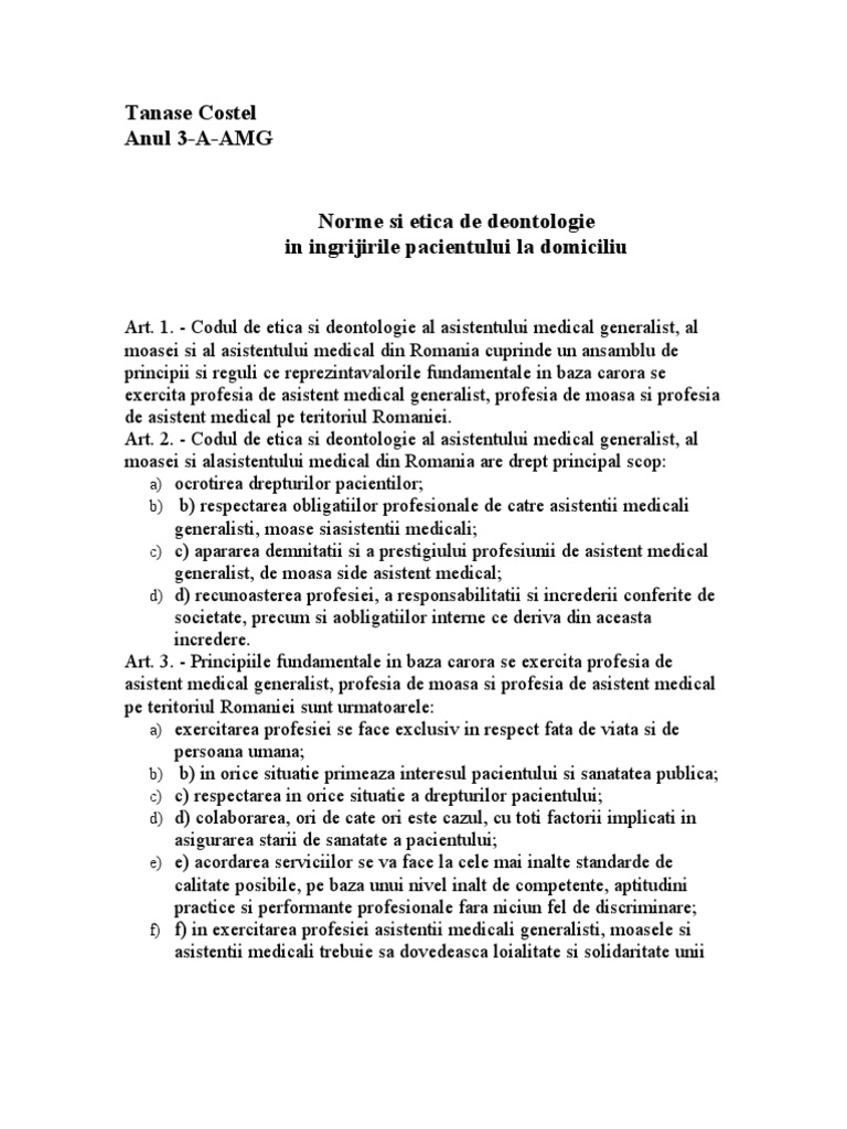 Codul de etica si deontologie al asistentului medical generalist al moasei si al asistentului medical din romania emitent. Acest referat descrie etica si deontologie profesionala. Arhiva contine 1 fisier doc de 3 pagini. 560 din 12 august 2009 capitolul 1 principii generale art.