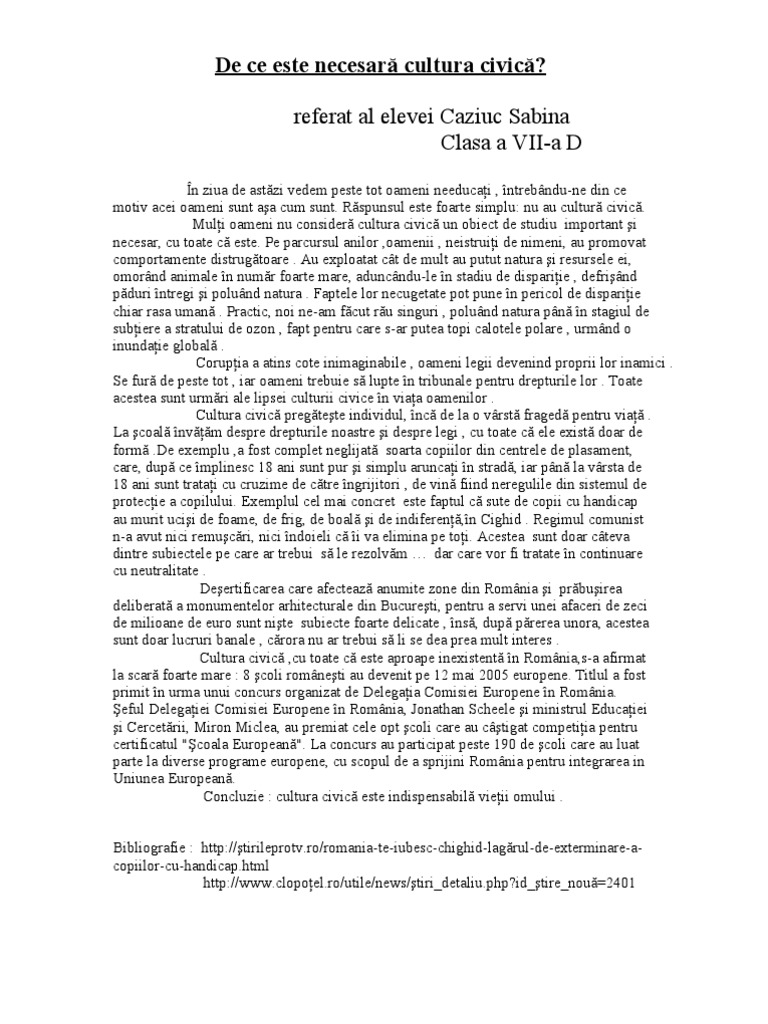 Drepturile copilului referat cultura civica. Chiar dacă nu aveți nevoie de această compunere pentru școală textul de mai jos merită citit și doar pentru simplul fapt de a ști că orice copil are drepturi garantate de societate. Pe scurt justiția este unică imparțială și egală pentru toți. Cultura civica drepturile copilului referat drepturile copilului drepturile copilului voi fi mare drepturile copilului eseu psihologia copilului protectia co. Ce trebuie să știi despre drepturile tale dacă ești om atunci ai drepturi și libertăți iar ele sunt scrise negru pe alb în constituție în titlul al ii lea alături de îndatoririle fiecărui român.