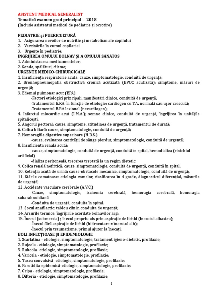 1137 06 09 2018 pentru aprobarea metodologiei de organizare și desfășurare a examenului de grad principal pentru asistenți. în data de 01 11 2018 examenul pentru asistenţi medicali generalişti surori medicale oficianţi medicali. înscrierea asistenților medicali la examenul de grad principal se va face la sediul direcției de sănătate publică județeană constanța din aleea lăcrămioarei nr 1 în perioada 08 10 23 10 2018 de luni până joi între orele 9 00 15 00 și vineri între orele 09 00 12 00 pentru toate specialitățile. Ordinul asistenților medicali generaliști moașelor și asistenților medicali din românia oamgmamr organizează prin filialele judeţene şi a municipiului bucureşti examenul de grad principal sesiunea 2018 conform ordinului ministrului sănătăţii nr.